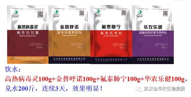 1、【白天控水】,集中4小時內喝完,飲水:高熱病毒靈100克+金替呼諾100克+氟泰肺寧100克+華農樂健100克,兌水200斤,連續(xù)3天,效果明顯!
