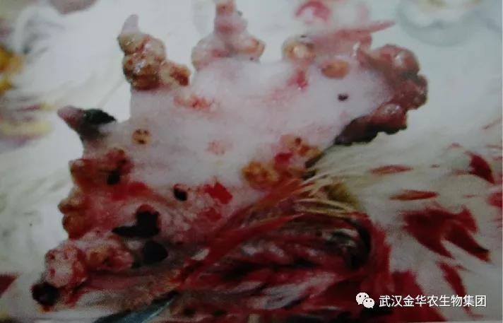 (3)嚴(yán)重時病變逐漸融合擴展,形成一層隆起的黃白色干酪樣假膜,強行剝離假膜,裸露出血的潰瘍面。假膜擴大、增厚,甚至阻塞咽喉部,引起病雞呼吸和吞咽困難。