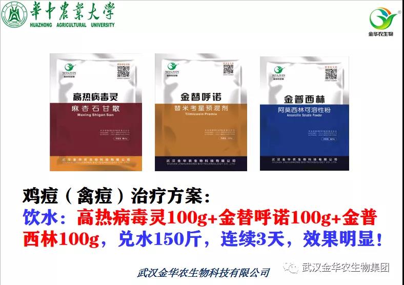 高熱病毒靈100g+金替呼諾100g+金普西林100g,兌水150斤,連續(xù)3天,效果明顯!