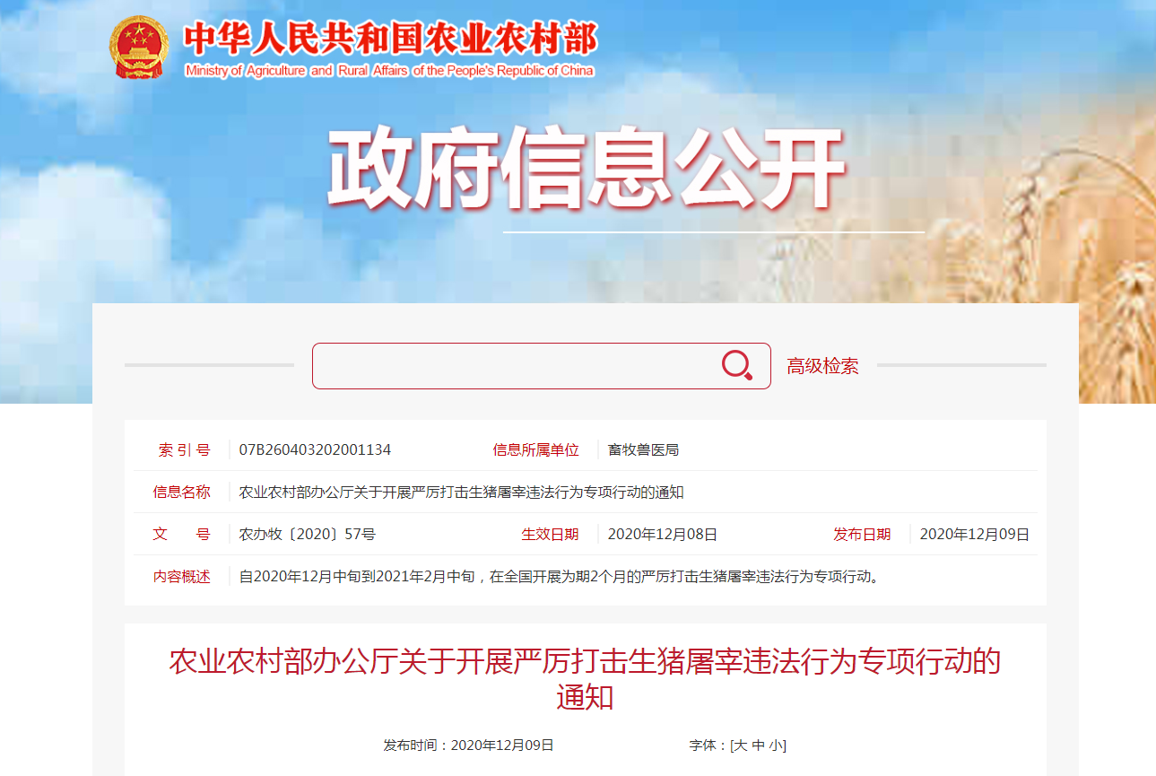 今年以來,各地通過開展農(nóng)產(chǎn)品質(zhì)量安全專項整治“利劍”行動,查辦了一批屠宰環(huán)節(jié)違法案件、搗毀了一批私屠濫宰窩點、銷毀了一批問題產(chǎn)品,有力支持了全國非洲豬瘟防控和生豬生產(chǎn)恢復(fù),有效保障了生豬產(chǎn)品質(zhì)量安全。隨著冬季,特別是元旦春節(jié)消費旺季的到來,豬肉產(chǎn)品消費將進入高峰期,從近期各地案件查辦情況看,私屠濫宰等屠宰環(huán)節(jié)違法案件呈上升趨勢。為切實維護生豬屠宰行業(yè)秩序,保證生豬產(chǎn)品質(zhì)量安全,保障節(jié)日期間豬肉消費安全和人民身體健康,農(nóng)業(yè)農(nóng)村部決定自2020年12月中旬到2021年2月中旬,在全國開展為期2個月的嚴厲打擊生豬屠宰違法行為專項行動。現(xiàn)就有關(guān)事項通知如下。