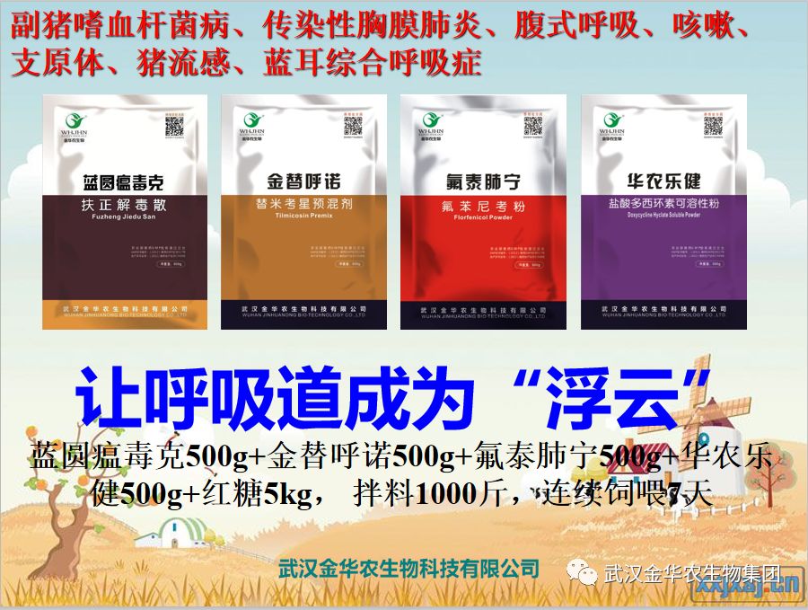 藍(lán)圓瘟毒克500 g+金替呼諾500g+氟泰肺寧500g+華農(nóng)樂500g+紅糖5kg,拌料1000斤,連續(xù)飼喂7天,對(duì)各種病毒細(xì)菌性呼吸道,效果明顯。