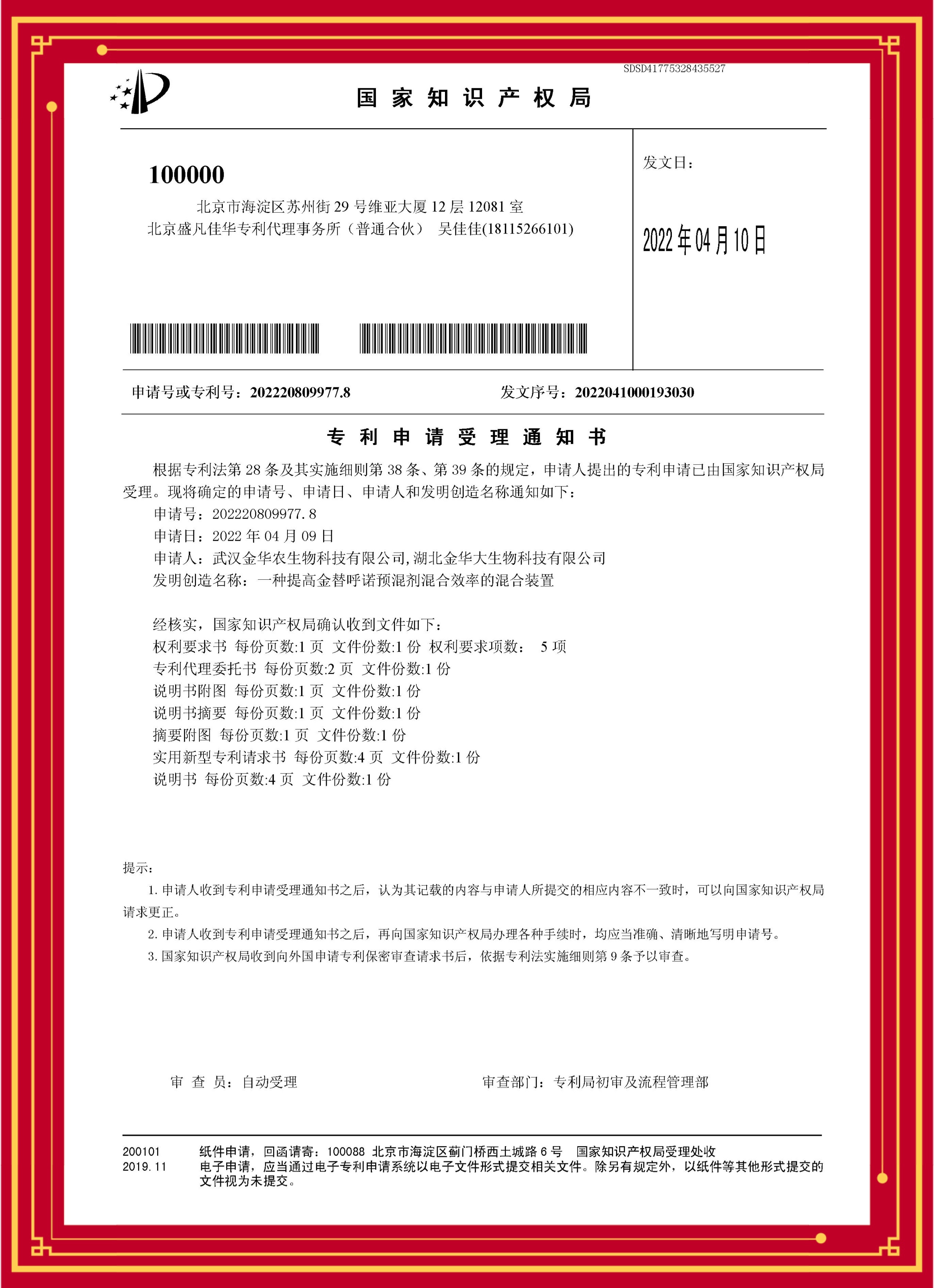 科技發(fā)明專利(金替呼諾):專利號(hào)—202220809977.8