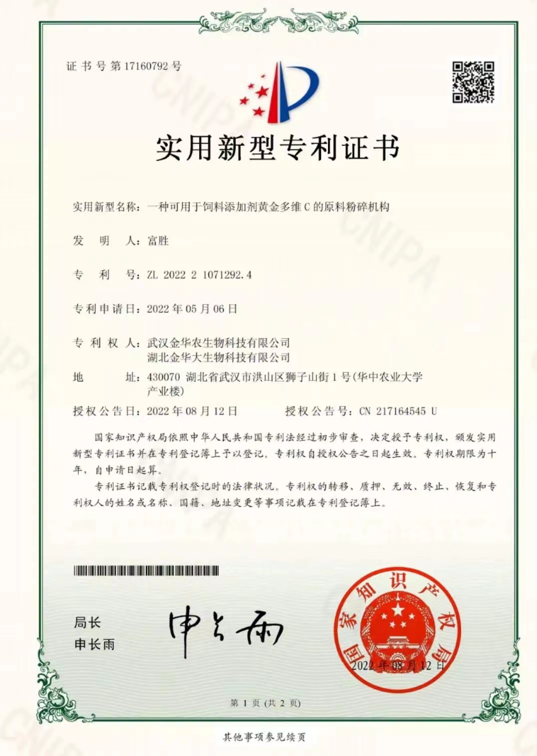 科技專利證書(黃金多維C):專利號(hào)—202221071292.4