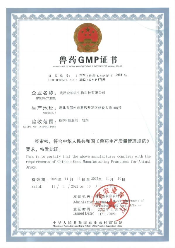 2022年11月11日,武漢金華農(nóng)生物科技有限公司喜獲國家新版獸藥GMP證、獸藥生產(chǎn)許可證。