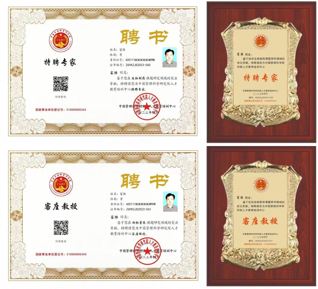 鑒于武漢金華農(nóng)生物科技有限公司在“動保生物制藥”與“動物營養(yǎng)”領(lǐng)域的影響力和杰出貢獻(xiàn),經(jīng)研究決定,特授予富勝董事長『中國管理科學(xué)研究院特聘專家』、『中國管理科學(xué)研究院客座教授』兩項榮譽(yù)。