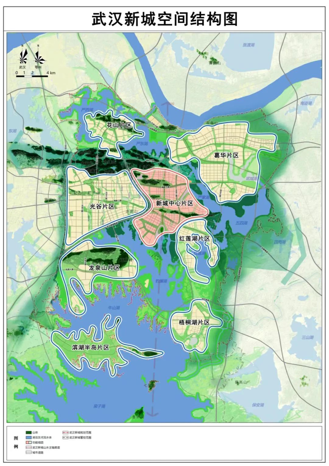根據(jù)今年2月發(fā)布的《武漢新城規(guī)劃》,武漢新城跨武漢、鄂州兩市,位于武鄂黃黃的地理中心,規(guī)劃面積約719平方公里,管控范圍面積約1689平方公里。已確定的年度十大行動和任務(wù)清單,主要集中在新城規(guī)劃體系、構(gòu)建基礎(chǔ)設(shè)施網(wǎng)絡(luò)、推進核心區(qū)建設(shè)三個方面。其中包括,深化完善武漢新城規(guī)劃,加快推進“七橫七縱”骨架路網(wǎng)建設(shè),打造總部經(jīng)濟區(qū)、科技金融區(qū)、創(chuàng)新服務(wù)區(qū)、高端商務(wù)區(qū),構(gòu)筑商務(wù)金融主軸等。