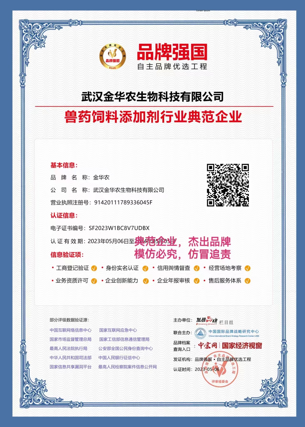 近日,武漢金華農(nóng)生物科技有限公司經(jīng)過(guò)資質(zhì)審核、輿情監(jiān)控等層層篩選,成功入選品牌強(qiáng)國(guó)·自主品牌優(yōu)選工程,并被評(píng)為“獸藥飼料添加劑典范企業(yè)”。企業(yè)信息將錄入品牌強(qiáng)國(guó)優(yōu)選工程數(shù)據(jù)庫(kù),在國(guó)家級(jí)平臺(tái)向公眾展示品牌形象。