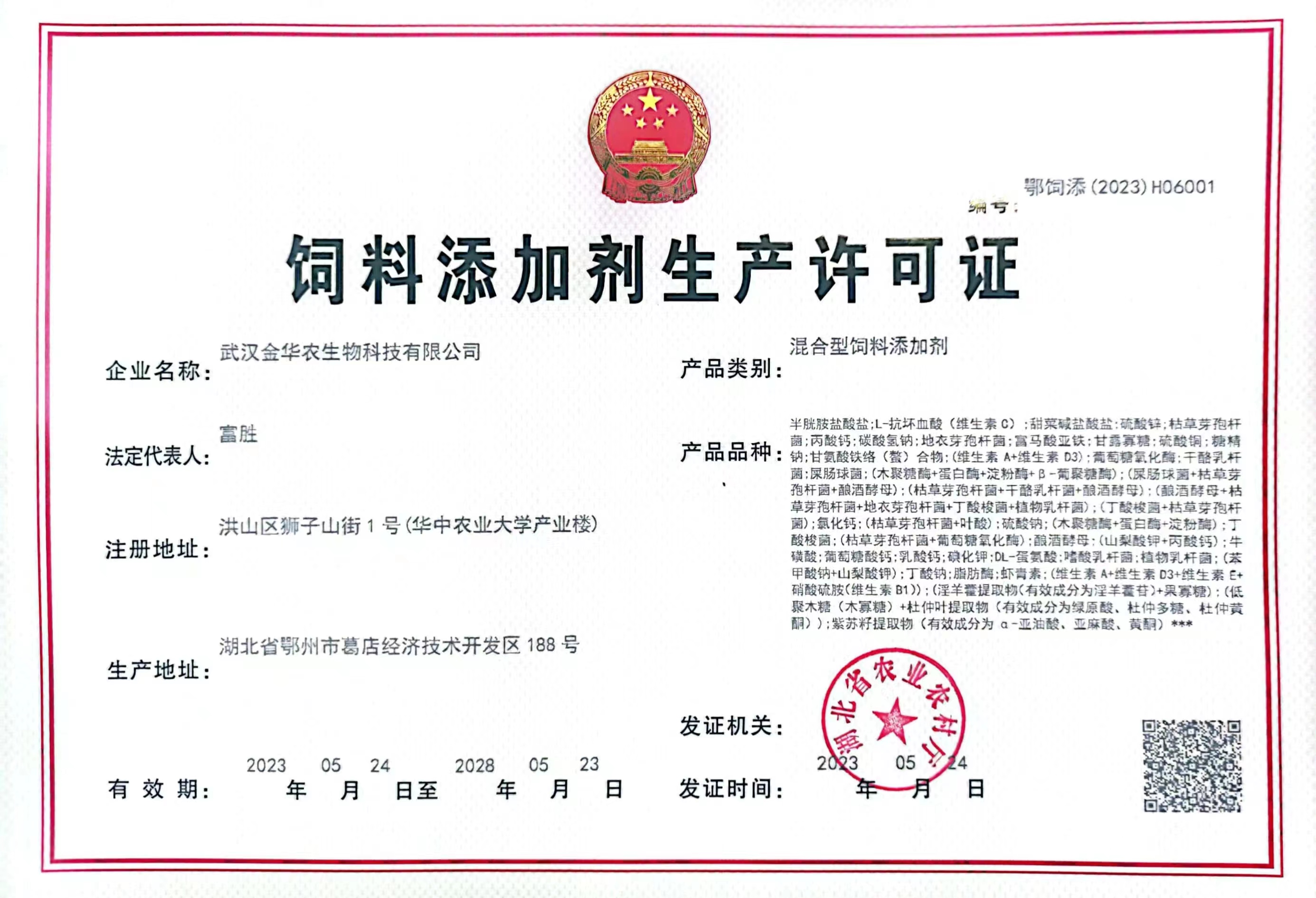 2023年5月24日,武漢金華農(nóng)生物科技有限公司(下文簡稱“武漢金華農(nóng)”)混合型飼料添加劑新生產(chǎn)線正式獲得湖北省農(nóng)業(yè)農(nóng)村廳頒發(fā)的“鄂飼添(2023)H06001生產(chǎn)許可證”和新的飼料添加劑45個新品種,這將進(jìn)一步完善公司產(chǎn)品的功能性覆蓋、進(jìn)一步擴(kuò)大市場占有率、進(jìn)一步促進(jìn)武漢金華農(nóng)的產(chǎn)業(yè)升級擴(kuò)容。