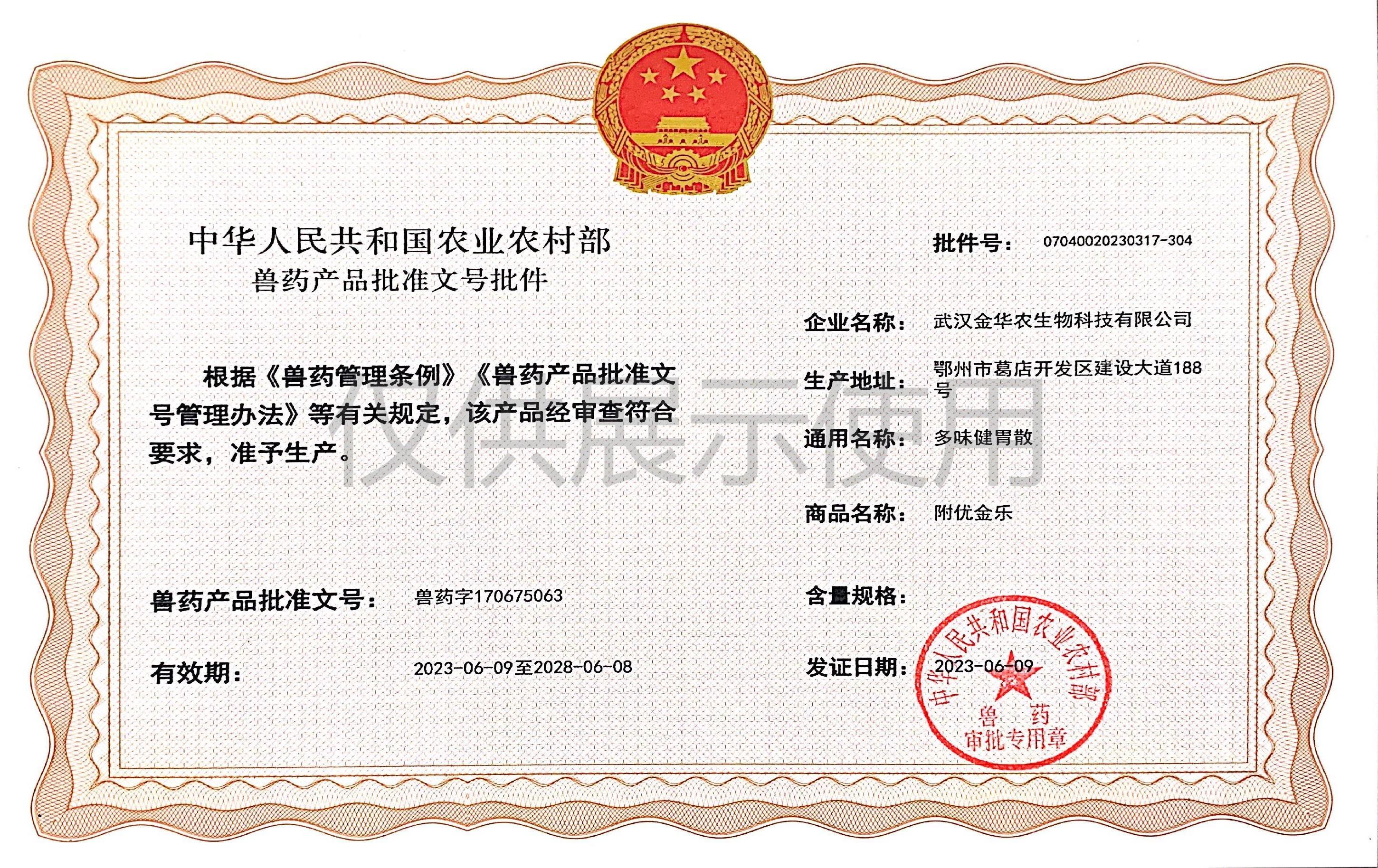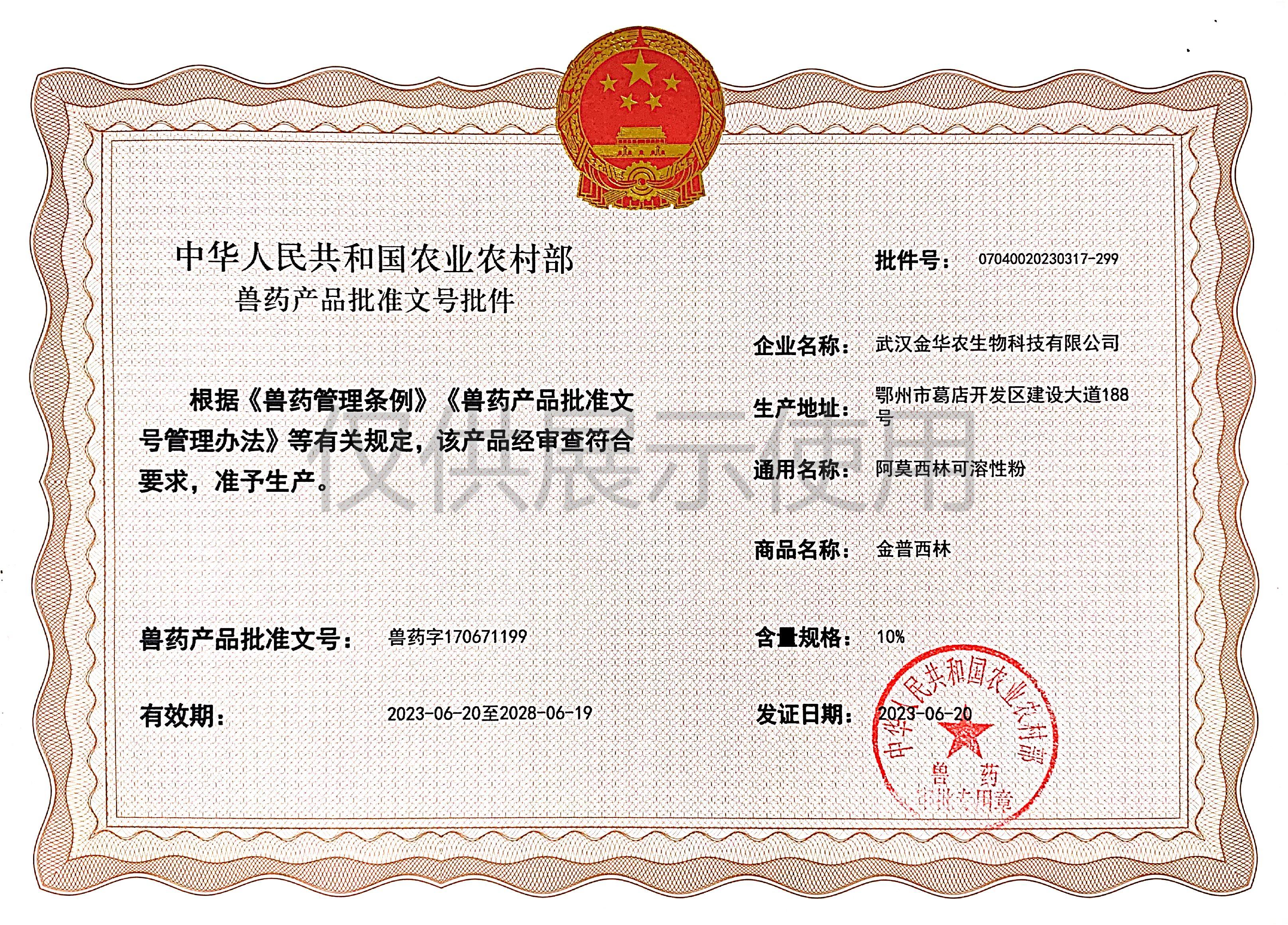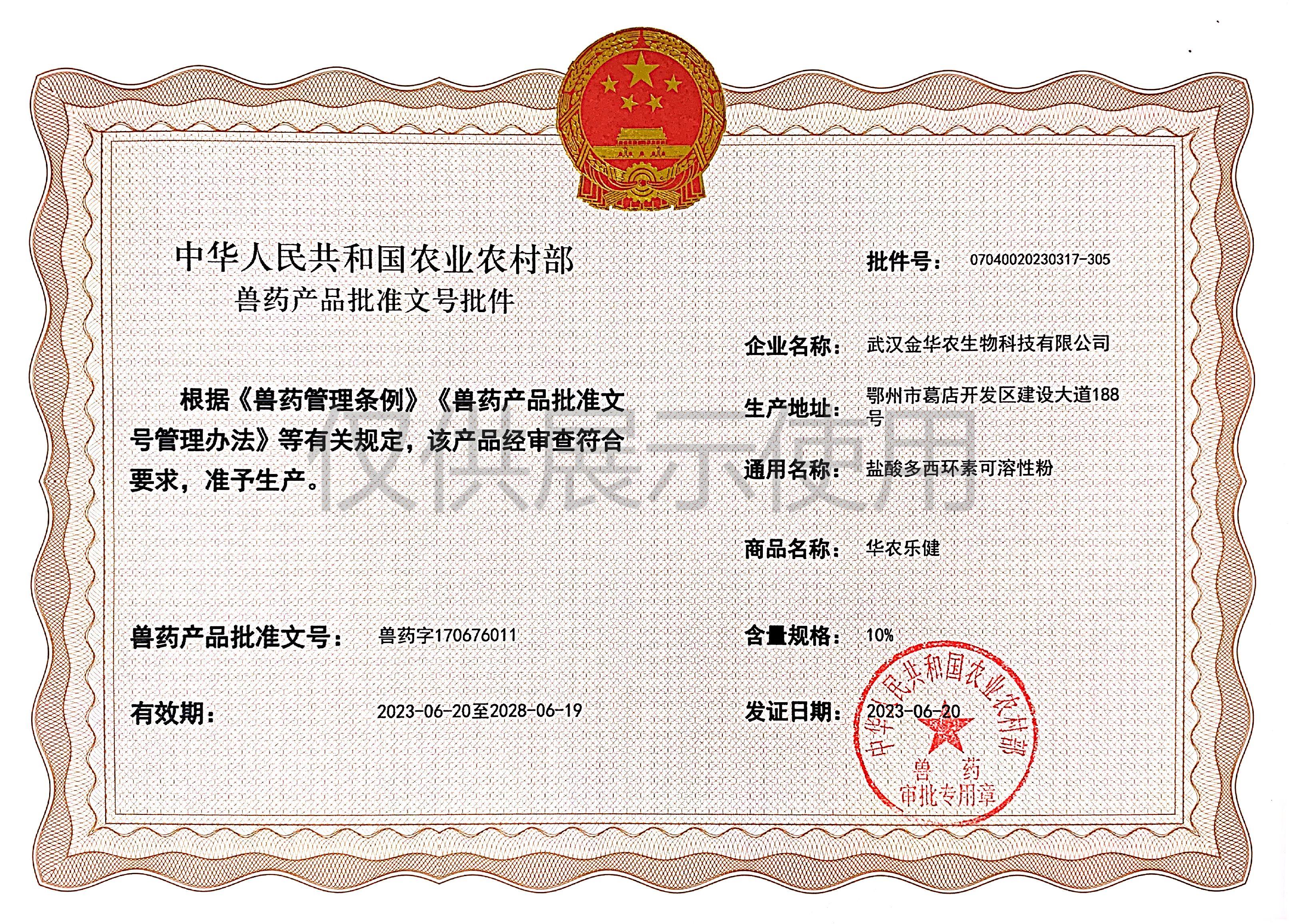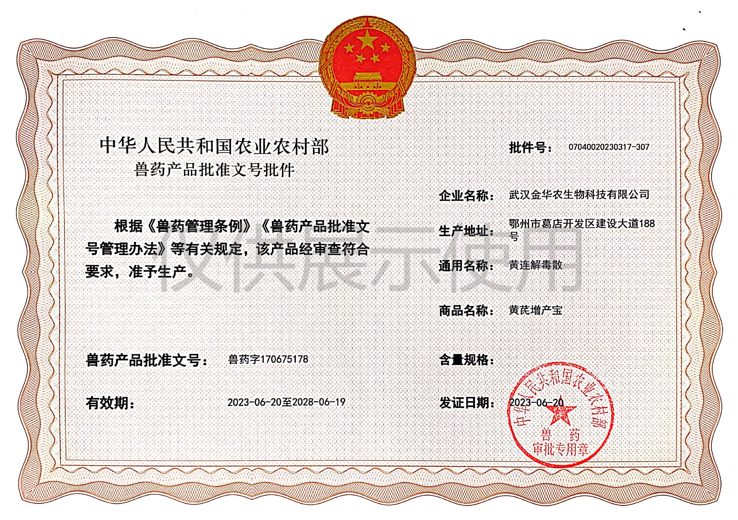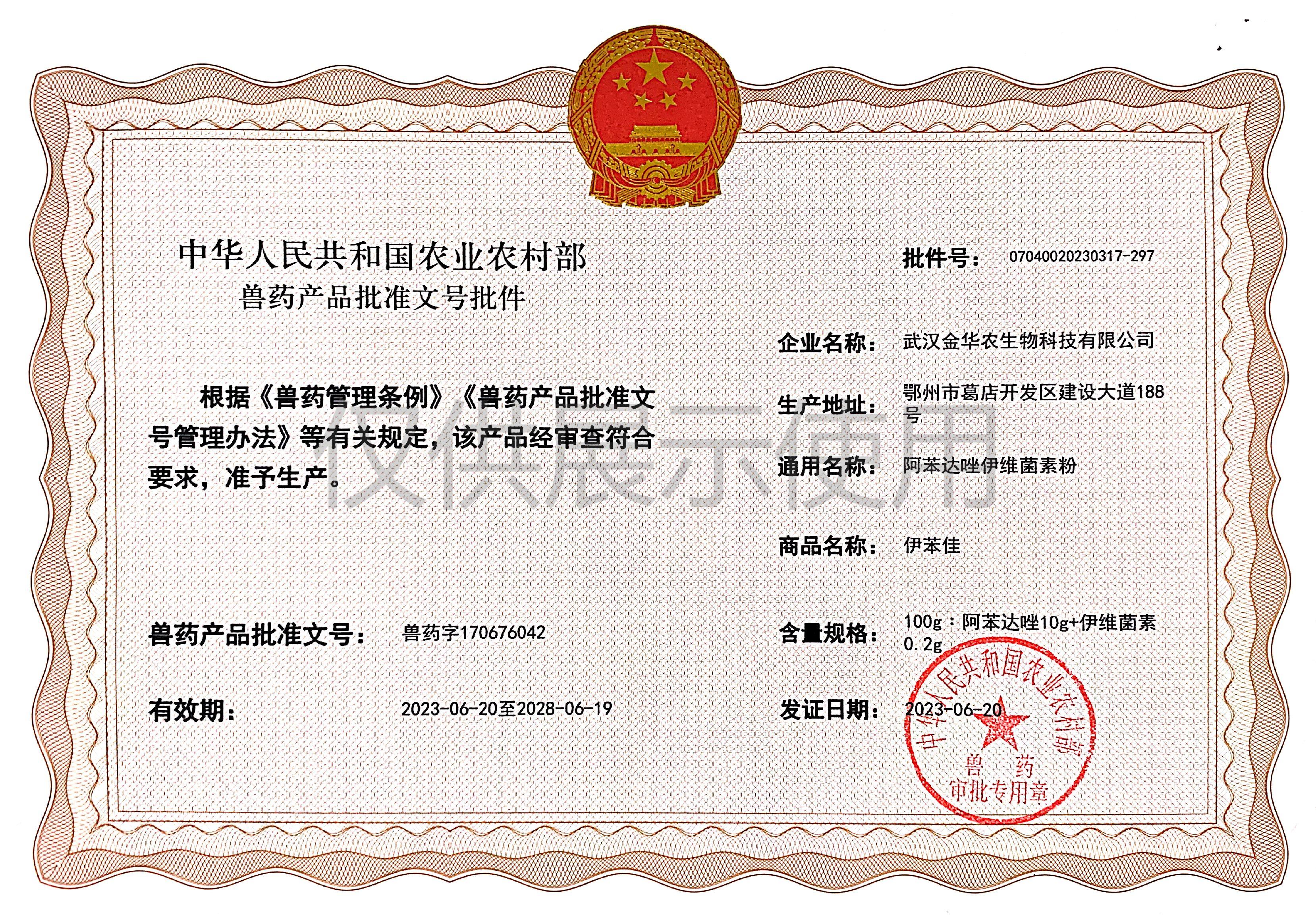 根據(jù)《獸藥管理條例》和《獸藥產(chǎn)品批準文號管理辦法》的規(guī)定,經(jīng)農(nóng)業(yè)農(nóng)村部審查,準予核發(fā)武漢金華農(nóng)生物科技有限公司(以下簡稱“武漢金華農(nóng)生物”)國家新版GMP6種獸藥相關(guān)產(chǎn)品批準文號,這是繼今年5月我司獲得第一批新版GMP獸藥批準文號后再一次獲得獸藥產(chǎn)品批準文號。