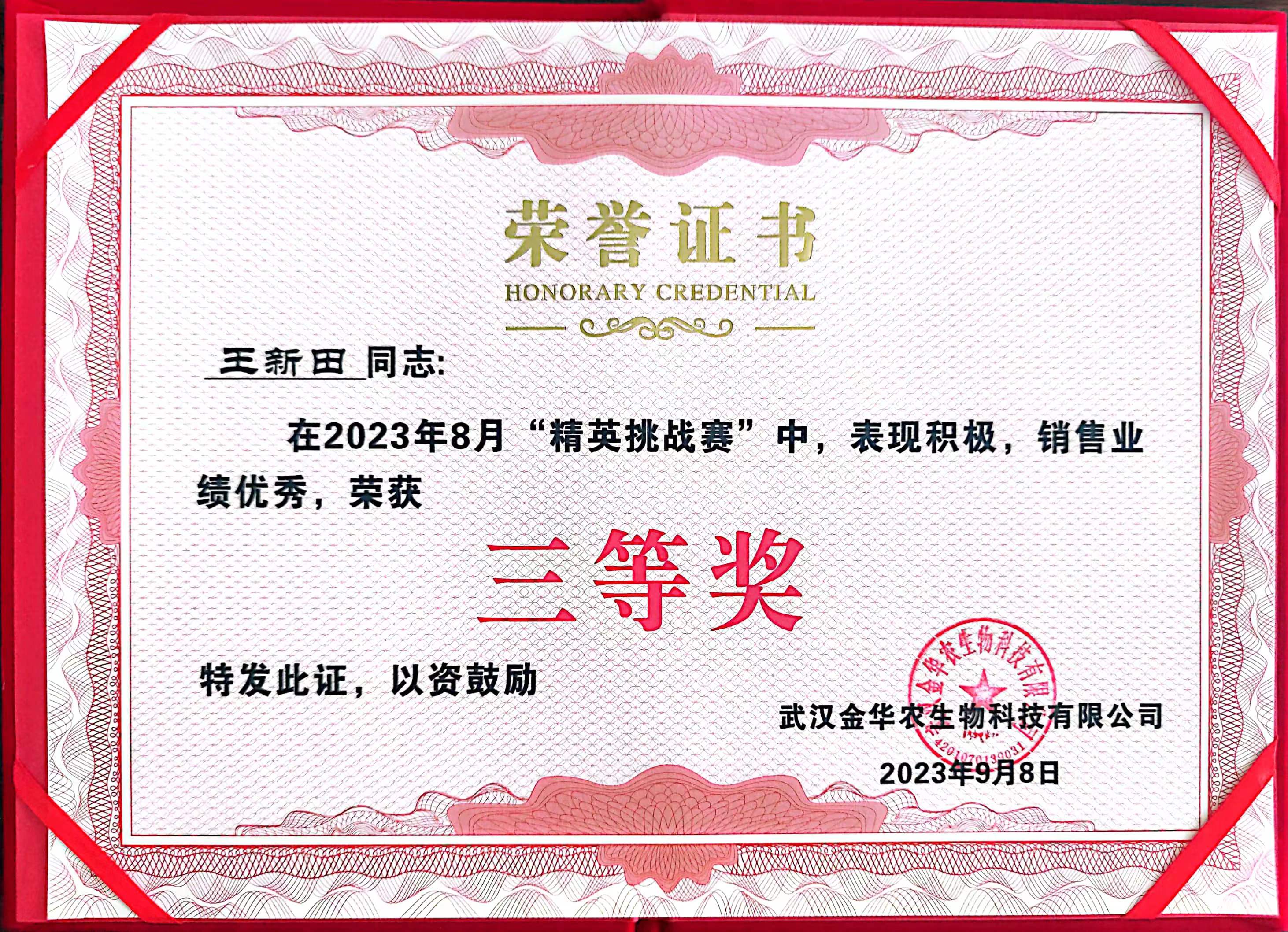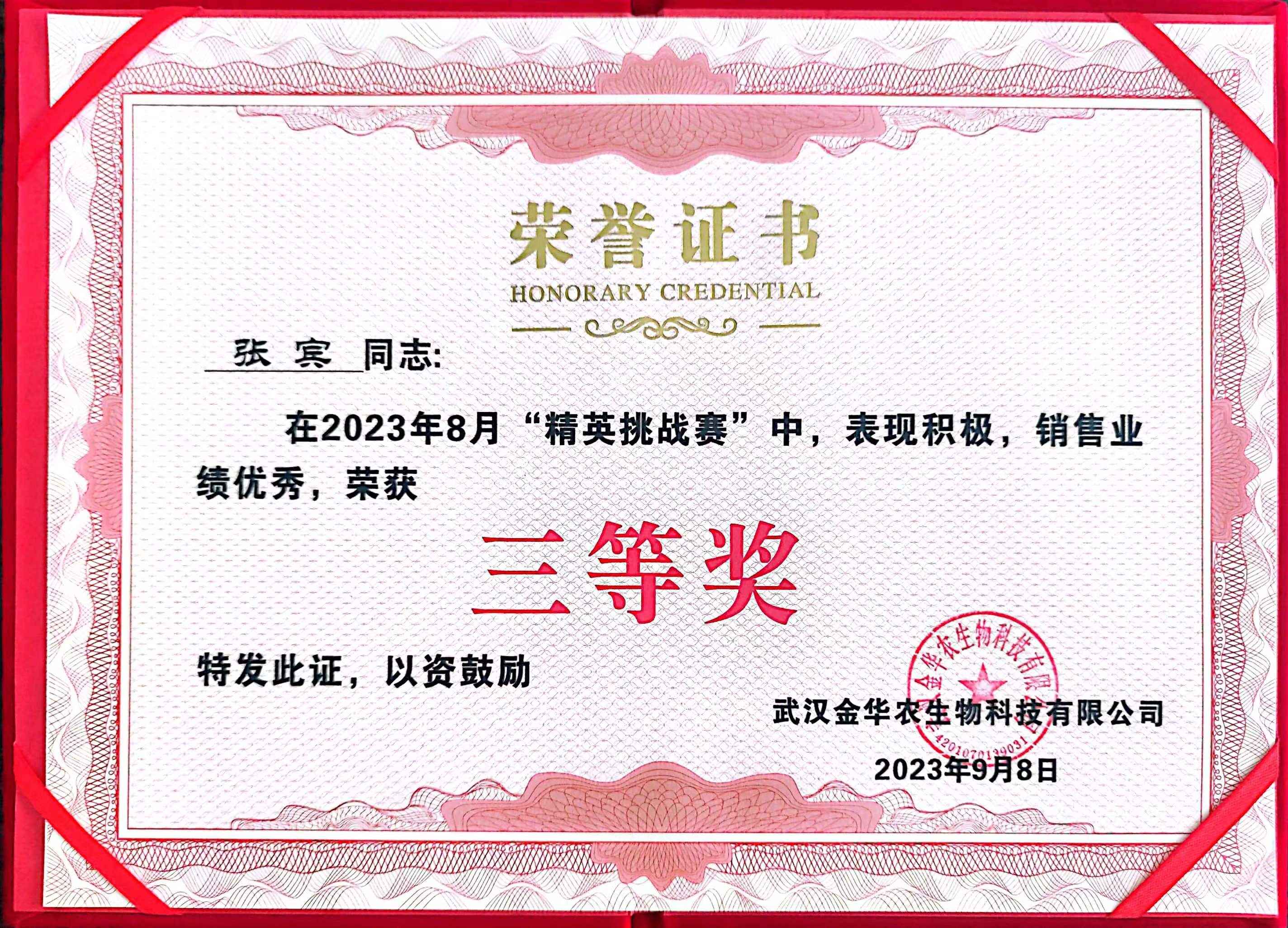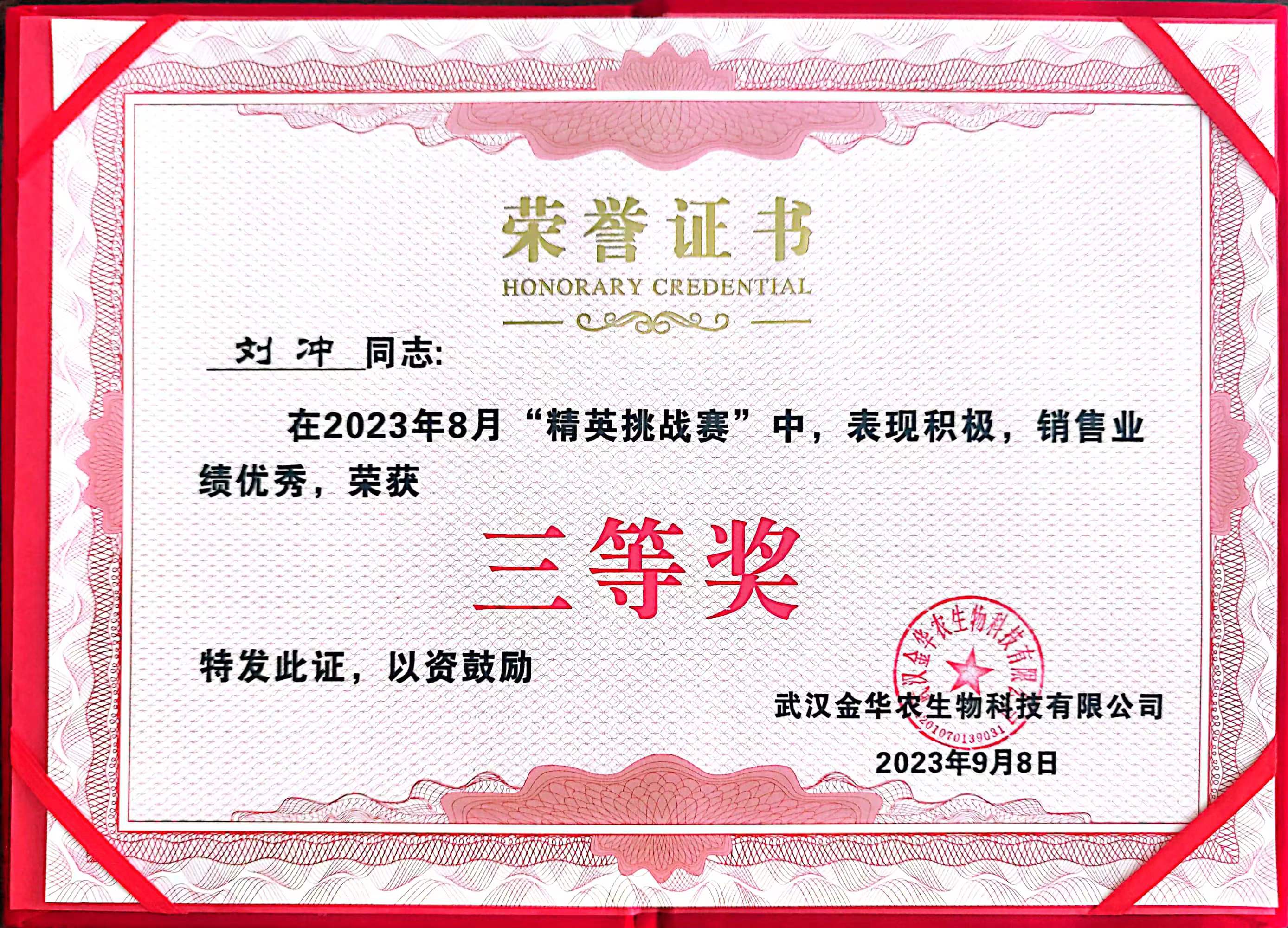 祝賀河北市場劉沖經理在2023年“精英挑戰(zhàn)賽”中榮獲三等獎。作為奮斗在市場一線的他,每天要面對形形色色的客戶,想客戶所想,急客戶所急,為客戶排憂解難,獲得了越來越多客戶的認可。一切為了銷售、業(yè)績就是最強有力的話語,他自身的價值也在銷售中得到淋漓盡致的體現。他必將帶動武漢金華農更加美好的明天。
