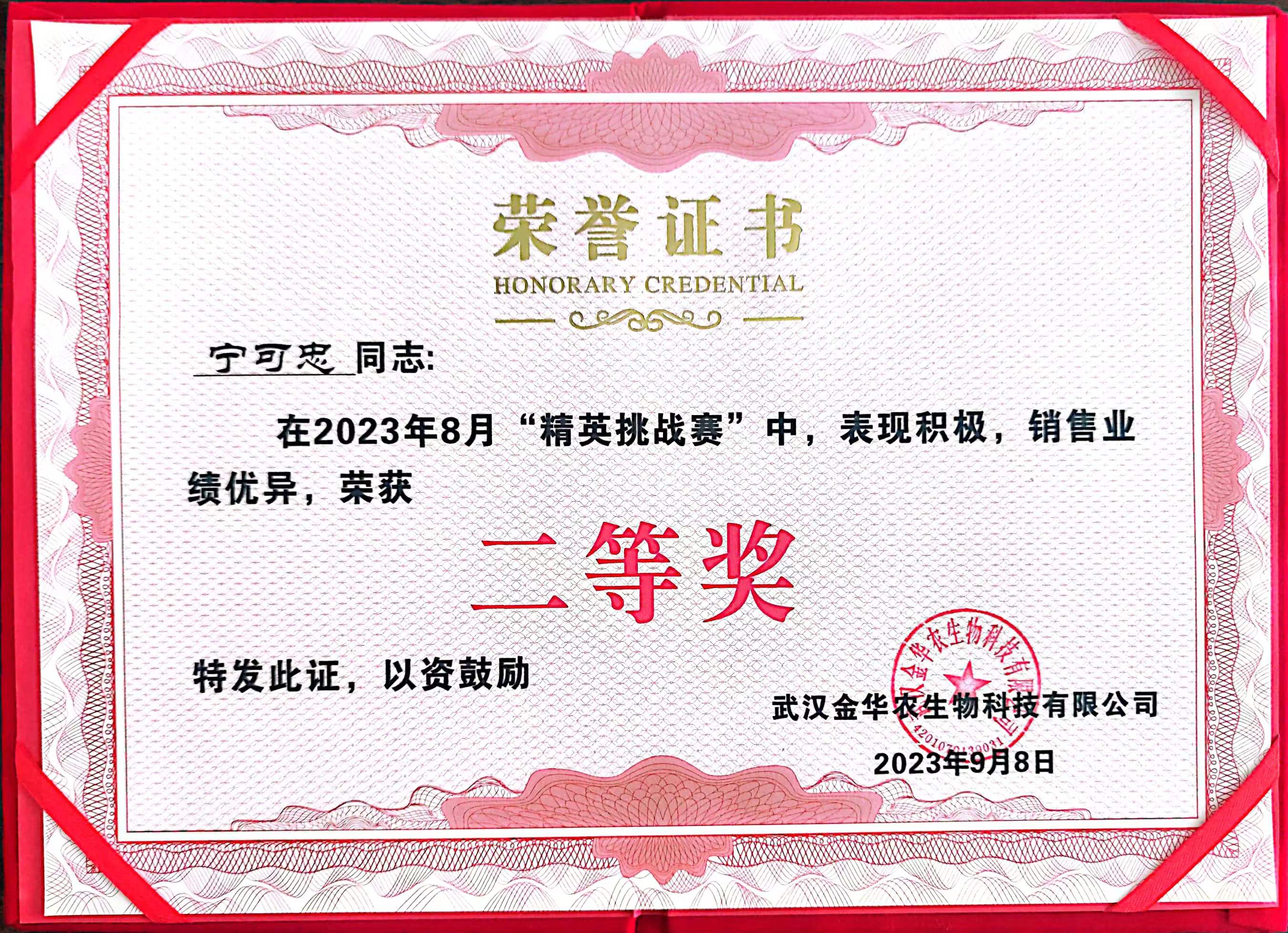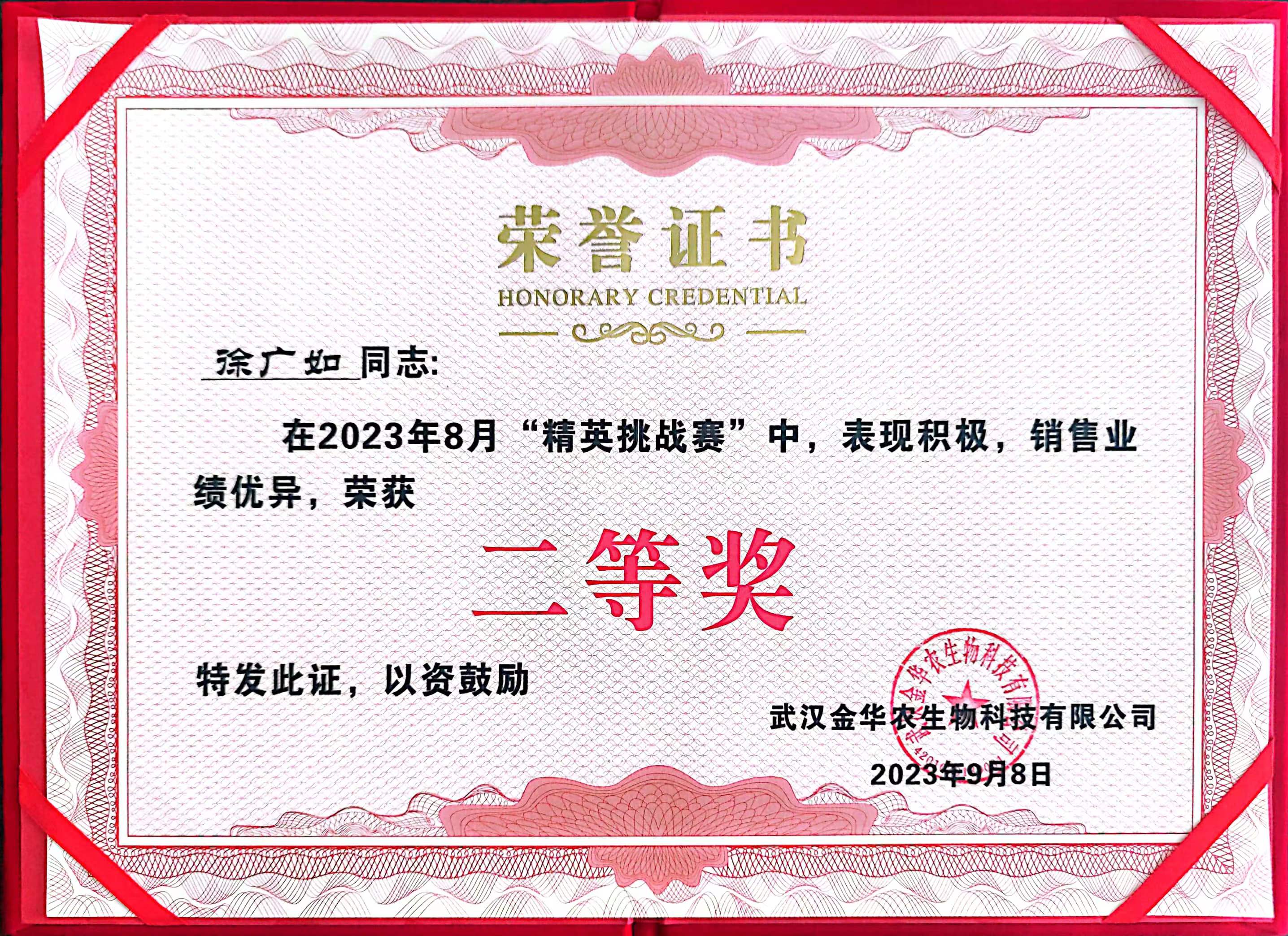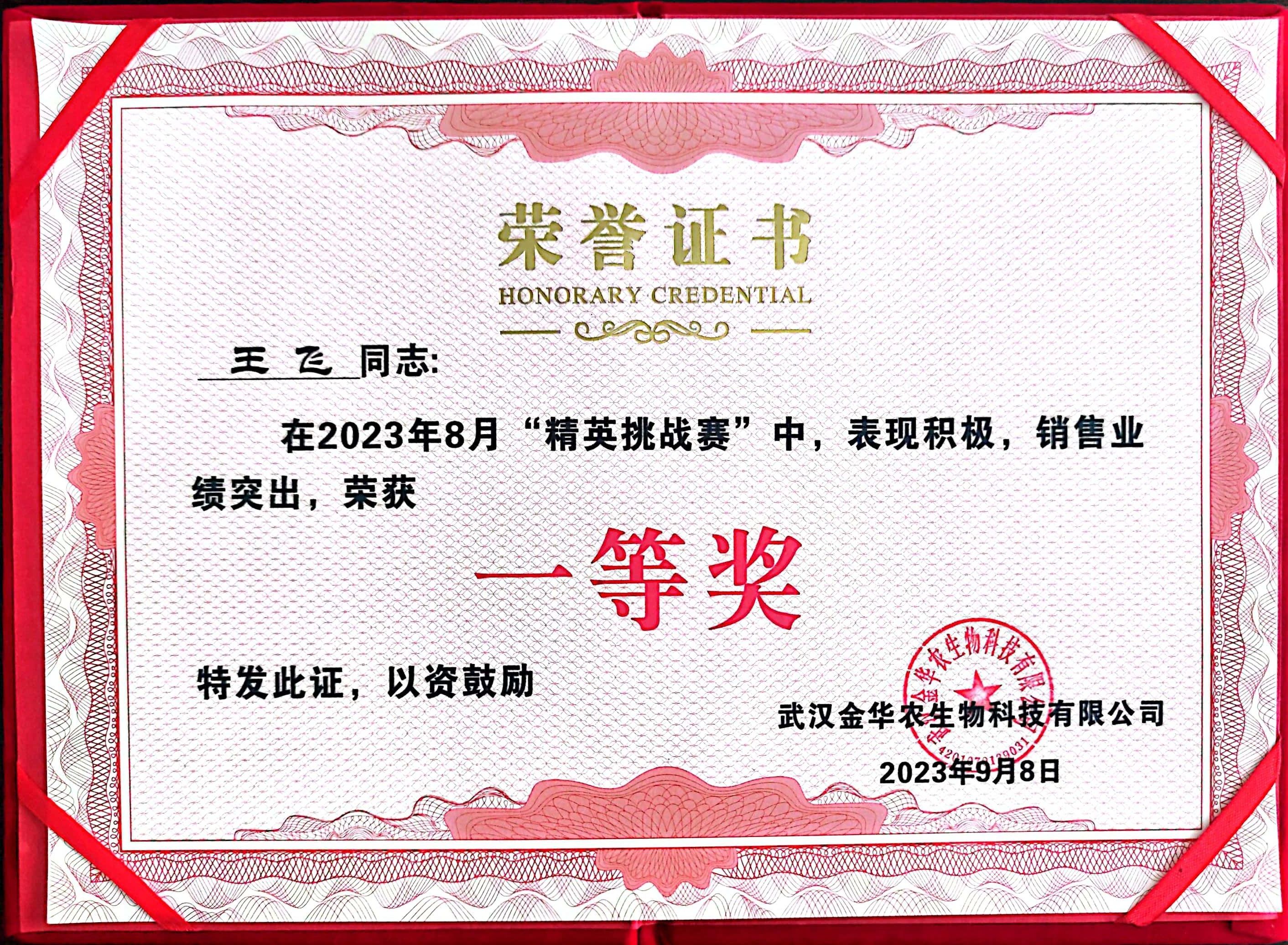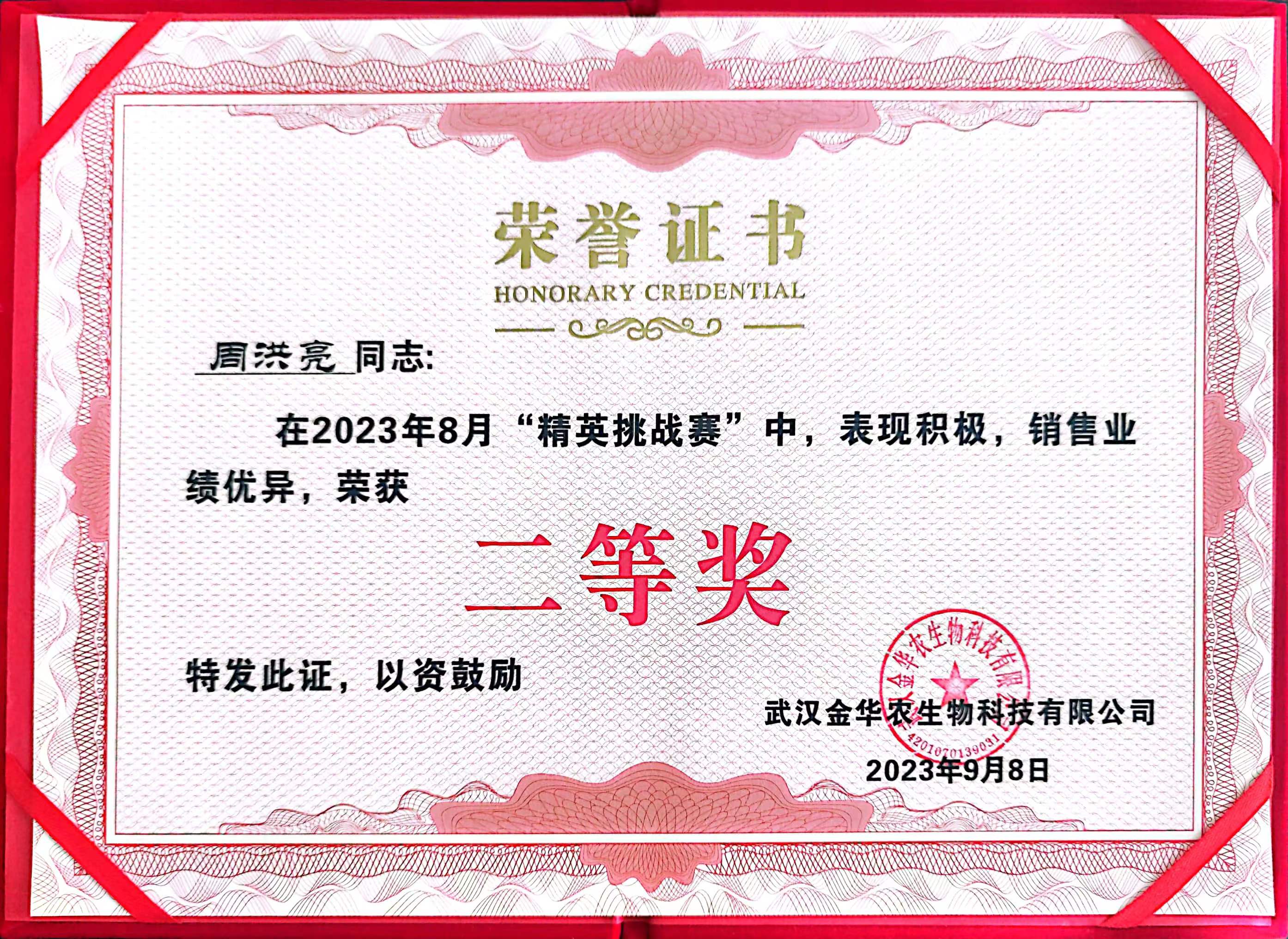 祝賀河北市場劉沖經理在2023年“精英挑戰(zhàn)賽”中榮獲三等獎。作為奮斗在市場一線的他,每天要面對形形色色的客戶,想客戶所想,急客戶所急,為客戶排憂解難,獲得了越來越多客戶的認可。一切為了銷售、業(yè)績就是最強有力的話語,他自身的價值也在銷售中得到淋漓盡致的體現。他必將帶動武漢金華農更加美好的明天。