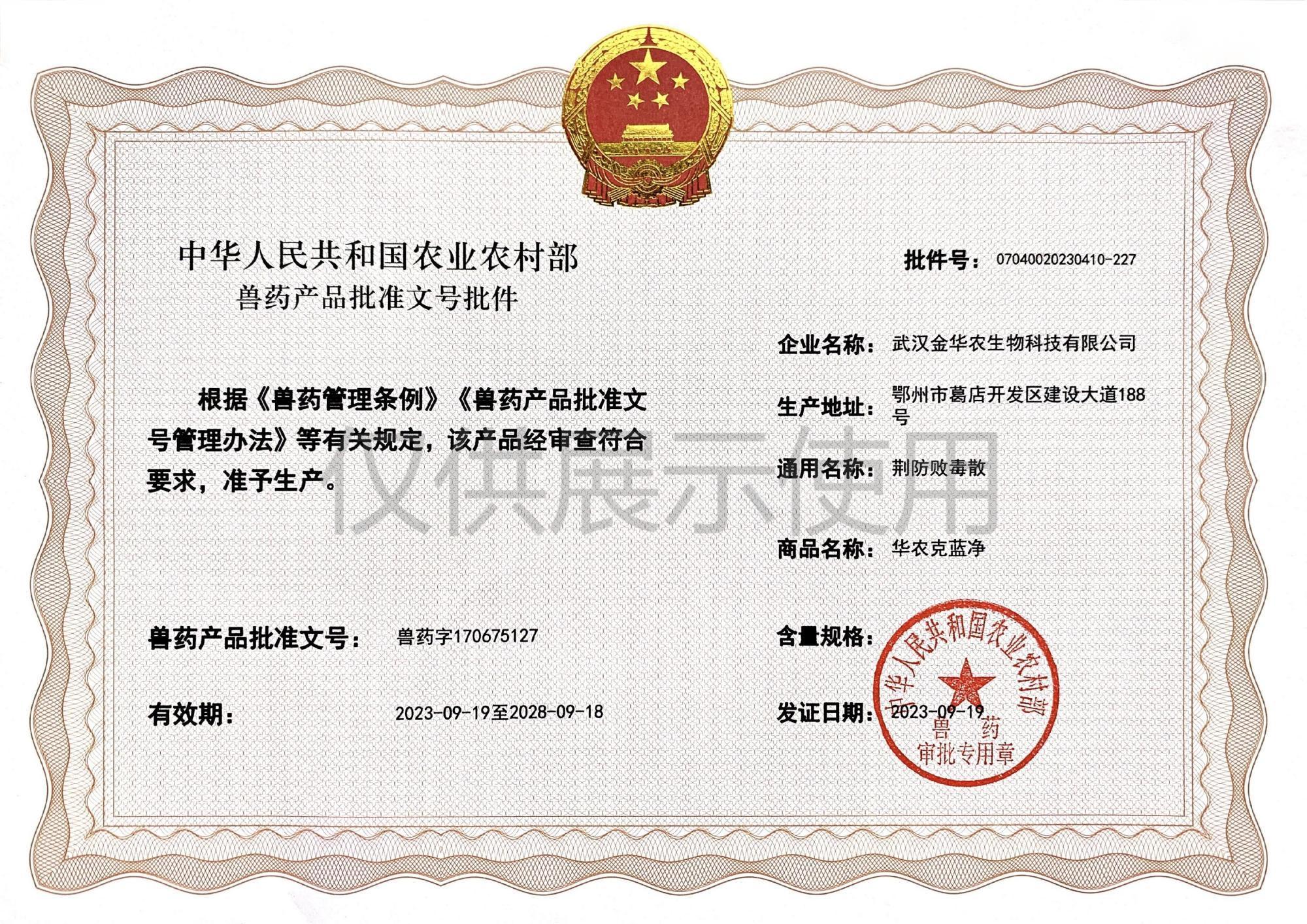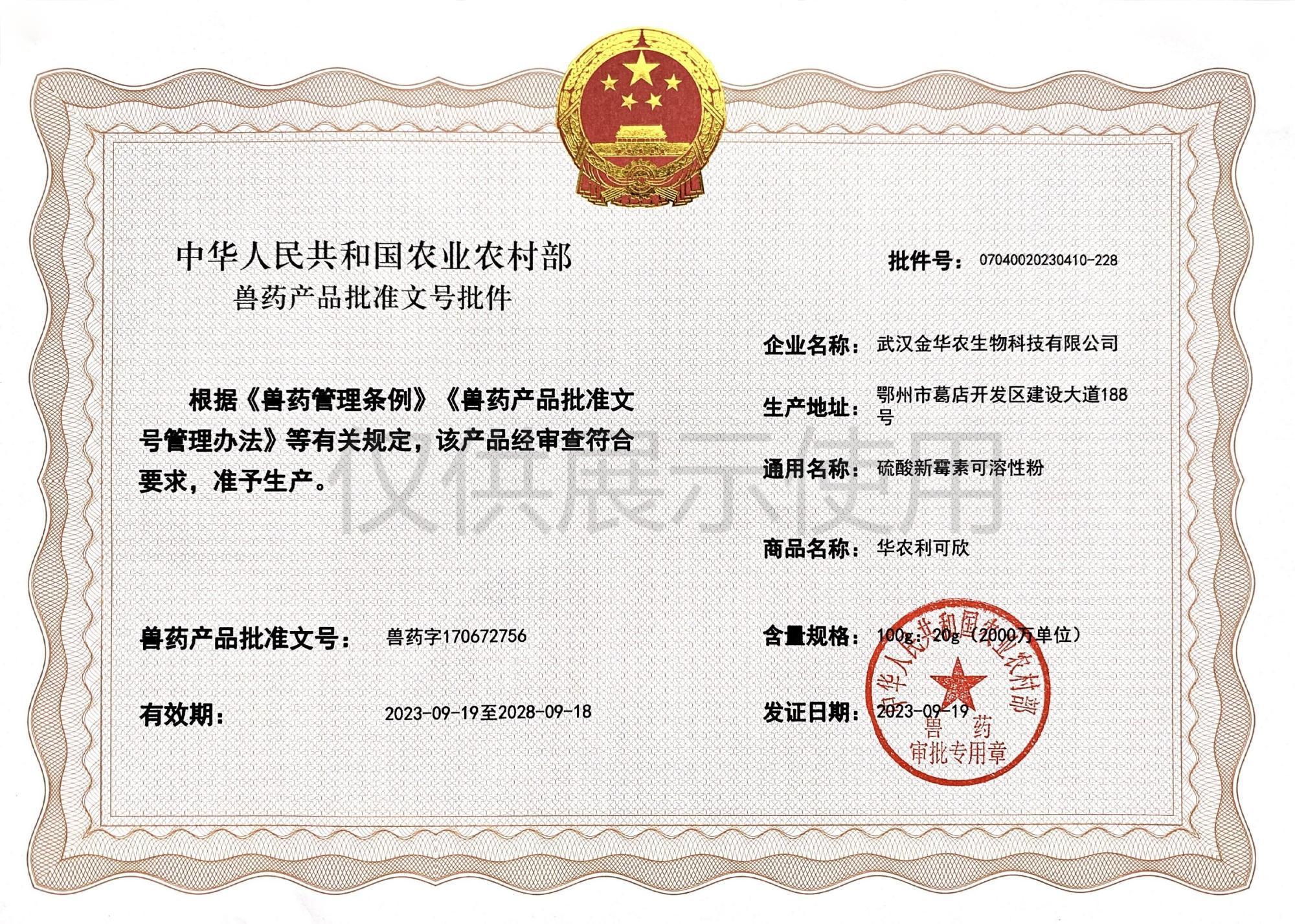 近日,我司申報(bào)的新獸藥“華農(nóng)感康靈”(荊防敗毒散)、“華農(nóng)利可欣”(20%硫酸新霉素可溶性粉)正式獲批,并獲得國農(nóng)業(yè)農(nóng)村部頒發(fā)的新獸藥產(chǎn)品批準(zhǔn)文號(hào)批件。