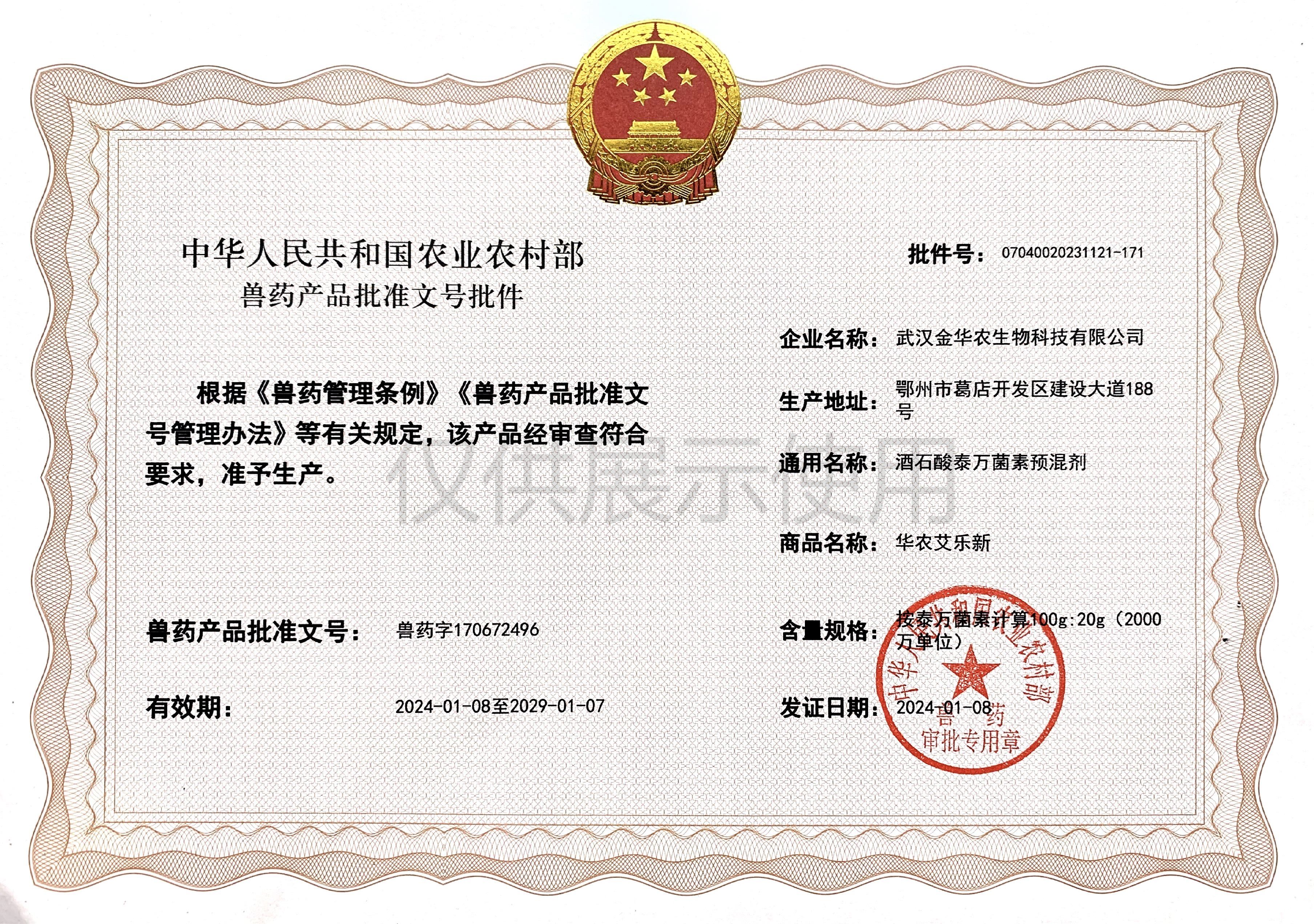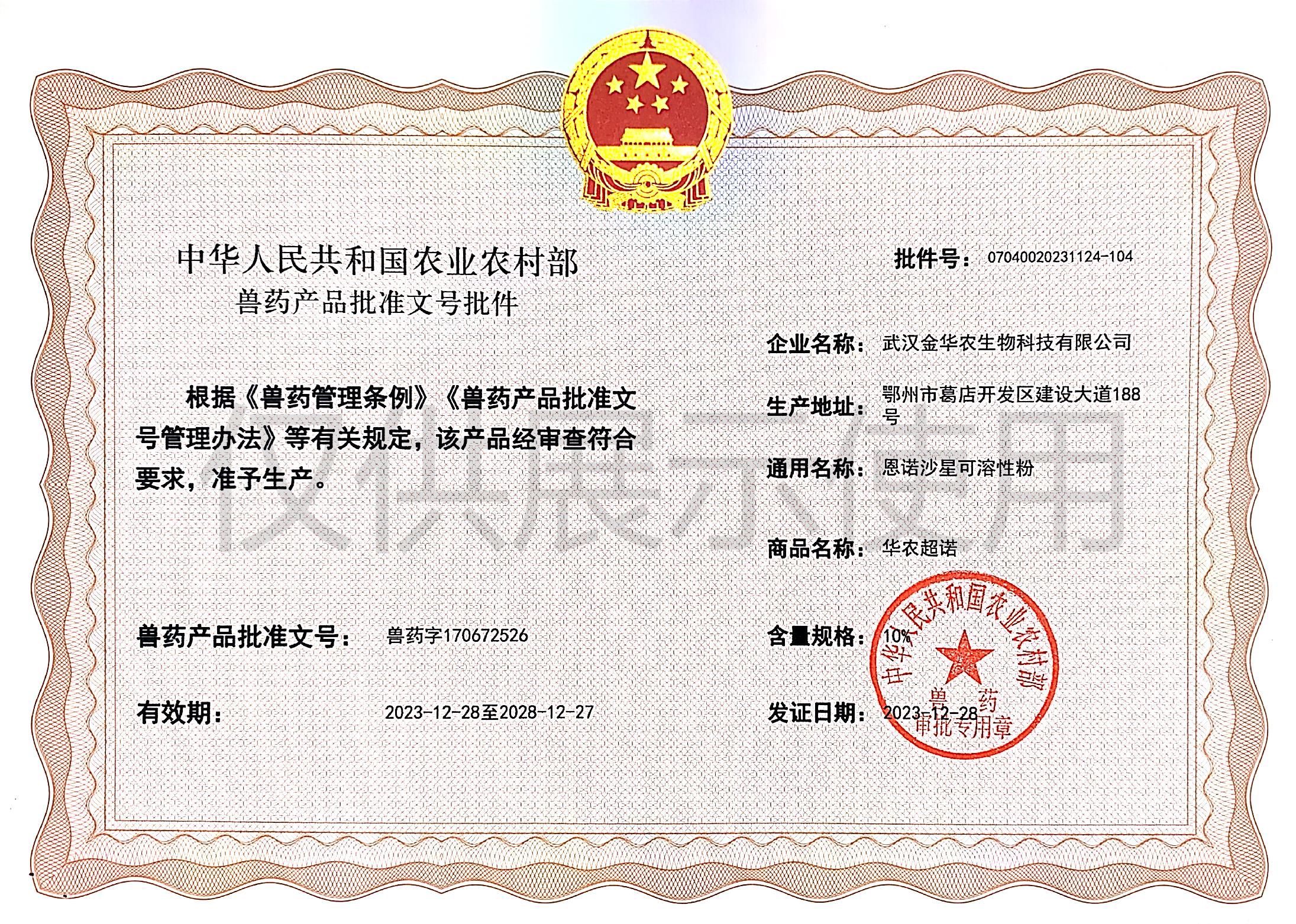 根據(jù)《獸藥管理條例》和《獸藥產(chǎn)品批準(zhǔn)文號管理辦法》的規(guī)定,經(jīng)農(nóng)業(yè)農(nóng)村部審查,準(zhǔn)予核發(fā)武漢金華農(nóng)生物科技有限公司2個新版GMP獸藥相關(guān)產(chǎn)品批準(zhǔn)文號。