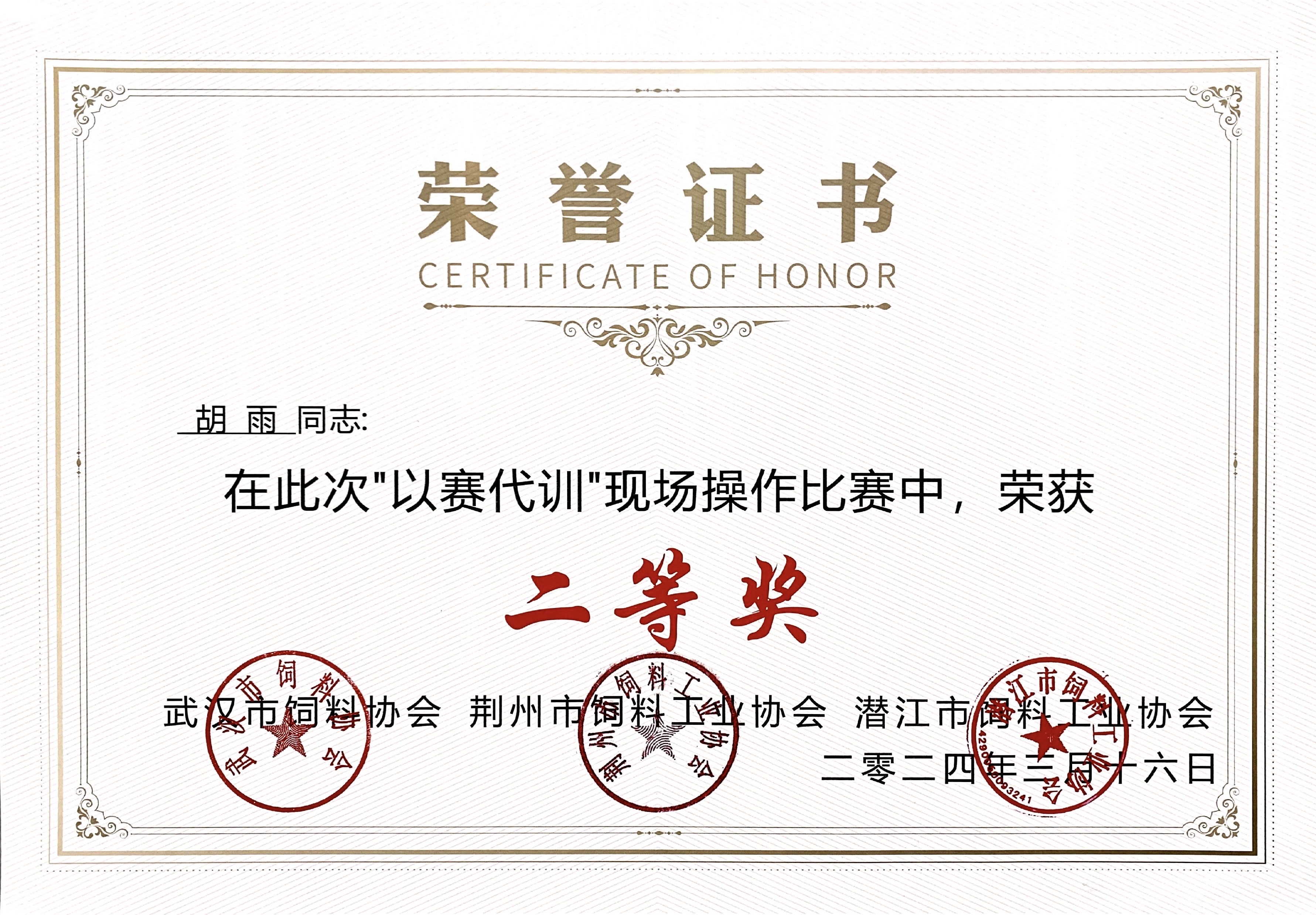 ? ? ??根據(jù)湖北省農(nóng)業(yè)農(nóng)村廳的相關(guān)精神,武漢市農(nóng)業(yè)農(nóng)村局積極組織實施,由武漢市飼料協(xié)會主辦的“以賽代訓”專業(yè)技能考試大PK活動圓滿落幕。在這場激烈的競爭中,我司質(zhì)量部胡雨憑借扎實的專業(yè)知識和出色的應(yīng)變能力,脫穎而出,榮獲比賽“二等獎”,為公司贏得了榮譽,同時也充分展現(xiàn)了個人風采,可喜可賀!大賽由武漢市飼料協(xié)會主辦,荊州市飼料工業(yè)協(xié)會、潛江市飼料工業(yè)協(xié)會承辦。共有40多名選手在比賽中競技爭鋒。
