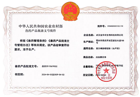 根據(jù)《獸藥管理?xiàng)l例》和《獸藥產(chǎn)品批準(zhǔn)文號(hào)管理辦法》的規(guī)定,經(jīng)農(nóng)業(yè)農(nóng)村部審查,準(zhǔn)予核發(fā)武漢金華農(nóng)生物科技有限公司3個(gè)新版GMP水產(chǎn)漁藥相關(guān)產(chǎn)品批準(zhǔn)文號(hào)。
