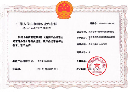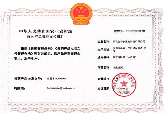 根據(jù)《獸藥管理?xiàng)l例》和《獸藥產(chǎn)品批準(zhǔn)文號(hào)管理辦法》的規(guī)定,經(jīng)農(nóng)業(yè)農(nóng)村部審查,準(zhǔn)予核發(fā)武漢金華農(nóng)生物科技有限公司2個(gè)新版GMP水產(chǎn)漁藥相關(guān)產(chǎn)品批準(zhǔn)文號(hào)。