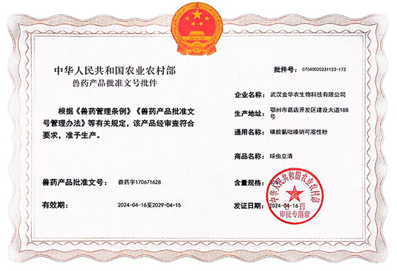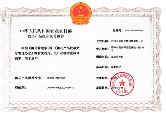 根據(jù)《獸藥管理條例》和《獸藥產(chǎn)品批準(zhǔn)文號管理辦法》的規(guī)定,經(jīng)農(nóng)業(yè)農(nóng)村部審查,準(zhǔn)予核發(fā)武漢金華農(nóng)生物科技有限公司2個新版GMP獸藥相關(guān)產(chǎn)品批準(zhǔn)文號。