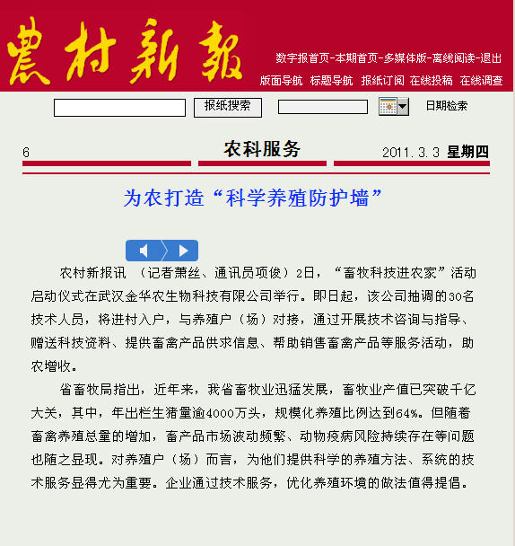 ??? 3月2日,我公司與湖北日報農村部聯(lián)合開展“畜牧科技進農家”活動,此活動揭牌儀式在武漢金華農生物科技有限公司會議大廳成功舉行。