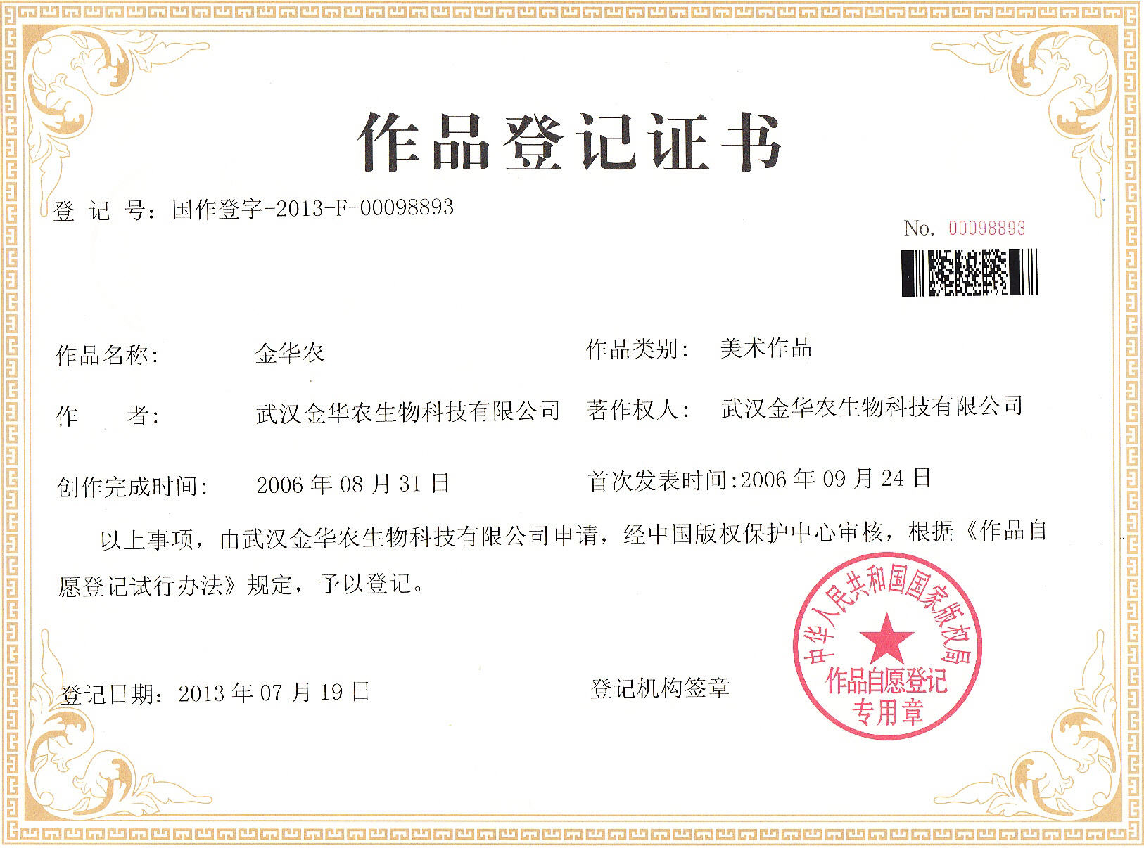 ? ? ? ?8月15日,公司正式收到由國家版權(quán)局榮譽(yù)頒發(fā)的《金華農(nóng)版權(quán)登記證書》,這標(biāo)志著公司品牌得到國家權(quán)威部門的法律保護(hù)。在動保獸藥、飼料添加劑領(lǐng)域,“金華農(nóng)”商標(biāo)及版權(quán),均歸屬于武漢金華農(nóng)生物科技有限公司所有。其他公司所涉及的“金華農(nóng)”產(chǎn)品均屬于假冒、仿冒和侵權(quán),本公司將保留追究其法律責(zé)任的權(quán)利 ?!敖鹑A農(nóng)”品牌的版權(quán)保護(hù),將進(jìn)一步鞏固武漢金華農(nóng)生物科技有限公司在國內(nèi)外獸藥、飼料添加劑等動保產(chǎn)品的市場地位、榮譽(yù)和知名度,將強(qiáng)有力的掃除公司在市場上快速發(fā)展的障礙,將使公司整體“一三五”戰(zhàn)略規(guī)劃向前急速推進(jìn)!