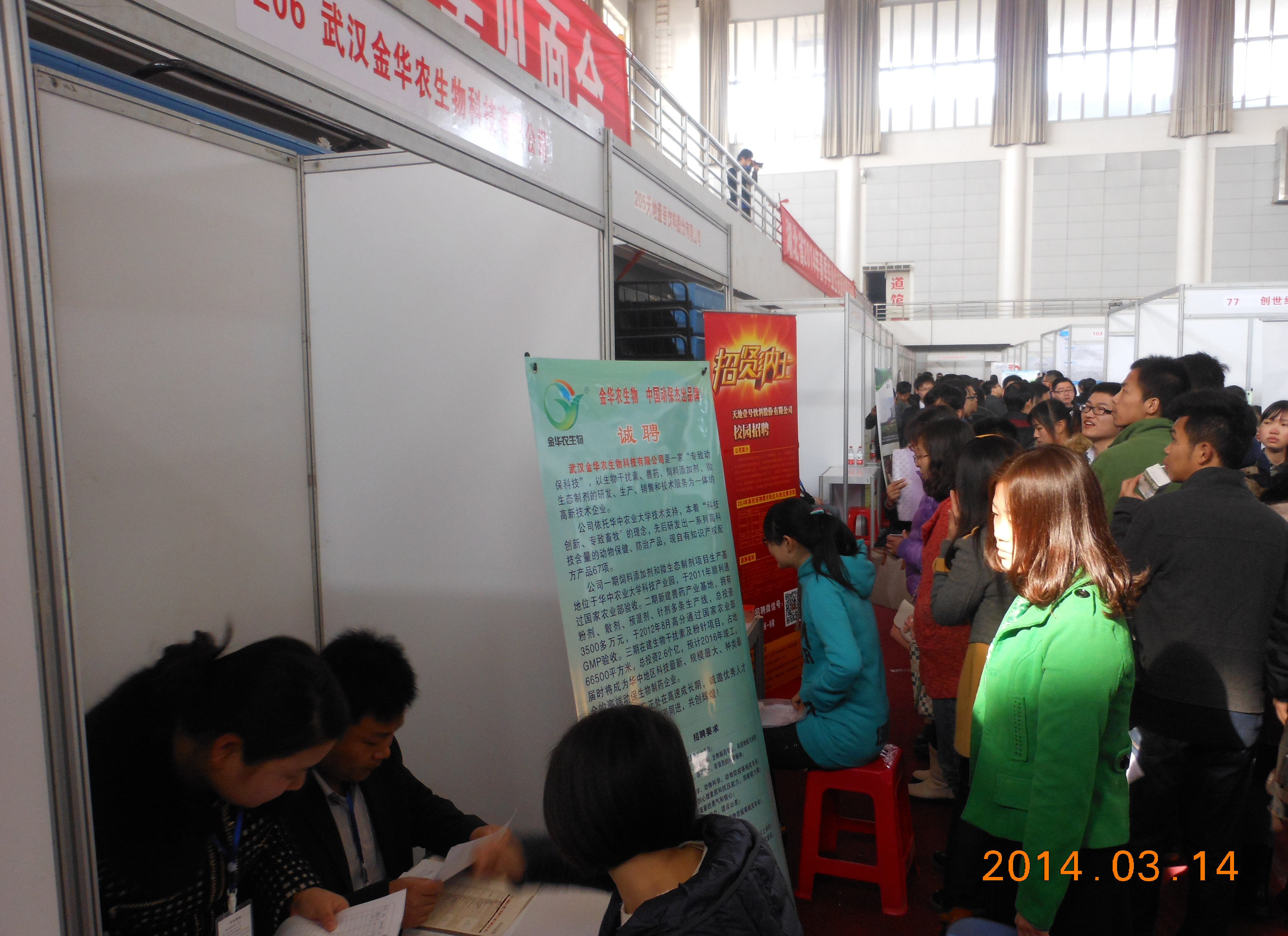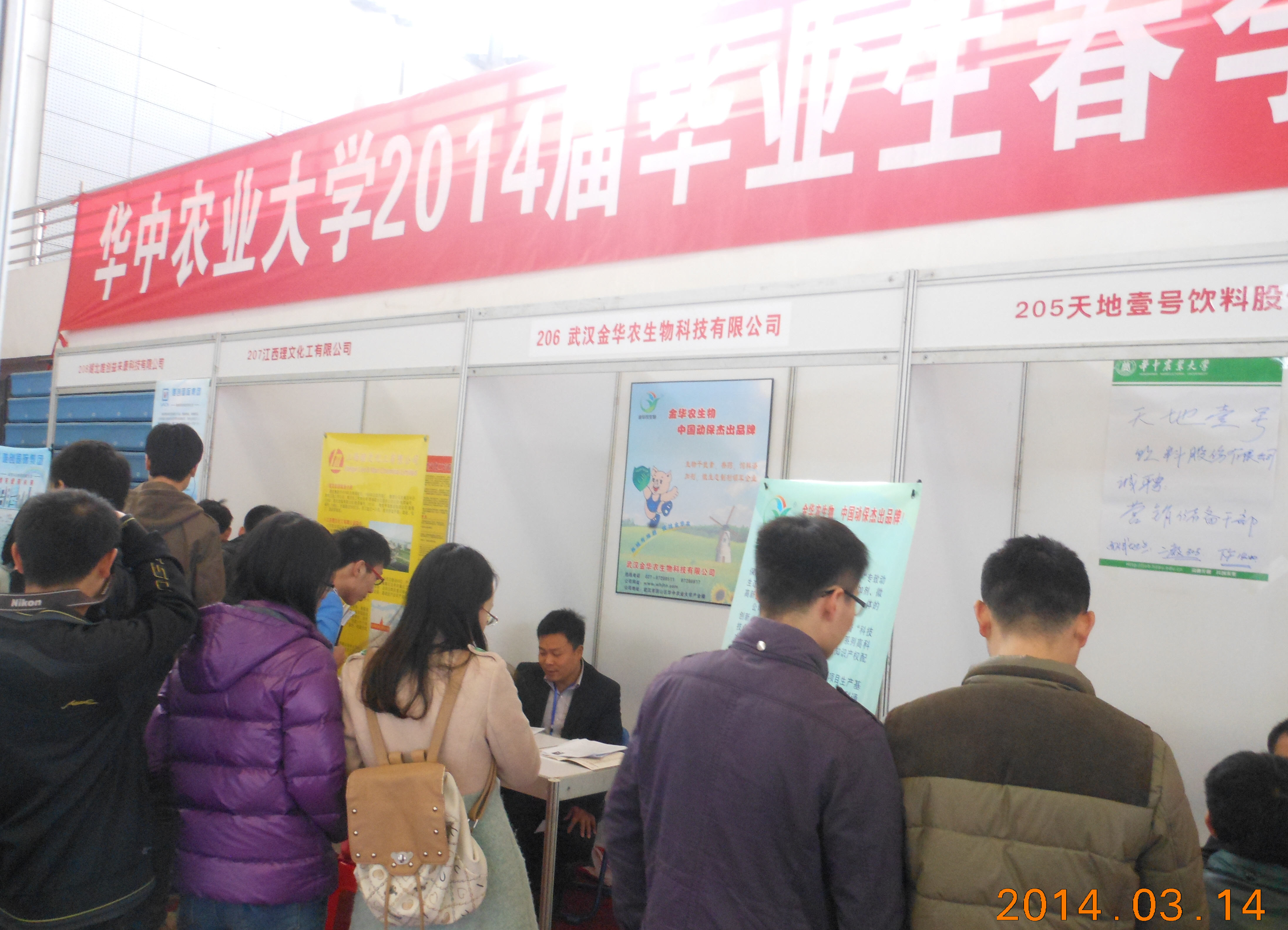 14日,華中農(nóng)業(yè)大學(xué)舉行2014屆畢業(yè)生春季供需見面會(huì),4850余名來自該校及附近高校的畢業(yè)生參加了現(xiàn)場見面會(huì) 。應(yīng)華中農(nóng)業(yè)大學(xué)學(xué)生工作處、華中農(nóng)業(yè)大學(xué)科技處的邀請(qǐng),武漢金華農(nóng)生物隆重出席了此次招聘會(huì),為公司的高速發(fā)展再次招攬優(yōu)秀人才。