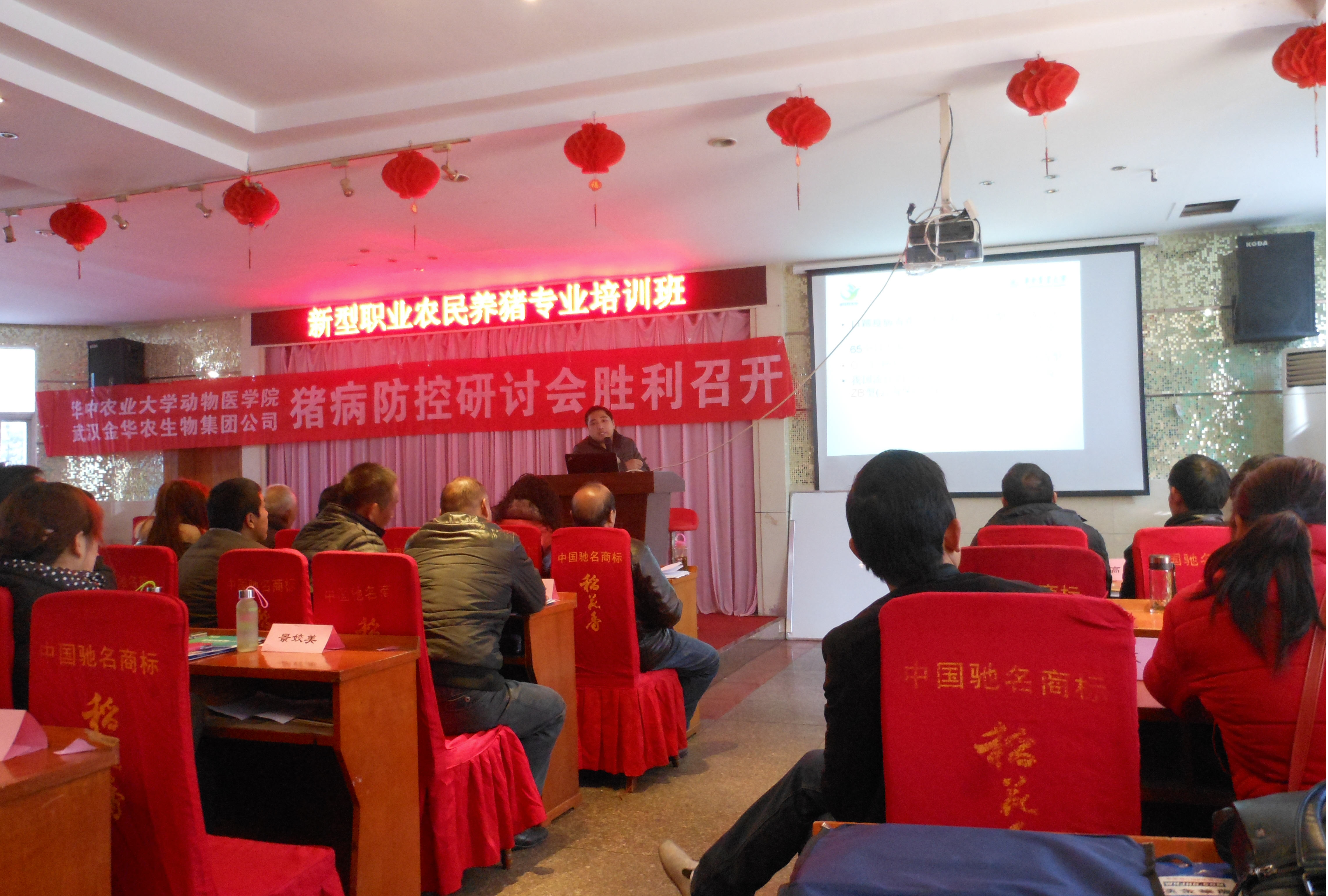 12月13日,受湖北省應(yīng)城市畜牧獸醫(yī)局的邀請,武漢金華農(nóng)生物公司聯(lián)合華中農(nóng)業(yè)大學(xué)動物醫(yī)學(xué)院相關(guān)專家,進駐應(yīng)城市養(yǎng)殖密集示范區(qū),開展“新型職業(yè)農(nóng)民養(yǎng)豬專業(yè)培訓(xùn)班”系列講座,為當(dāng)?shù)?00多家規(guī)?;B(yǎng)殖場進行豬病診斷、常見病防治、飼養(yǎng)管理、用藥組合等專業(yè)培訓(xùn),培訓(xùn)班取