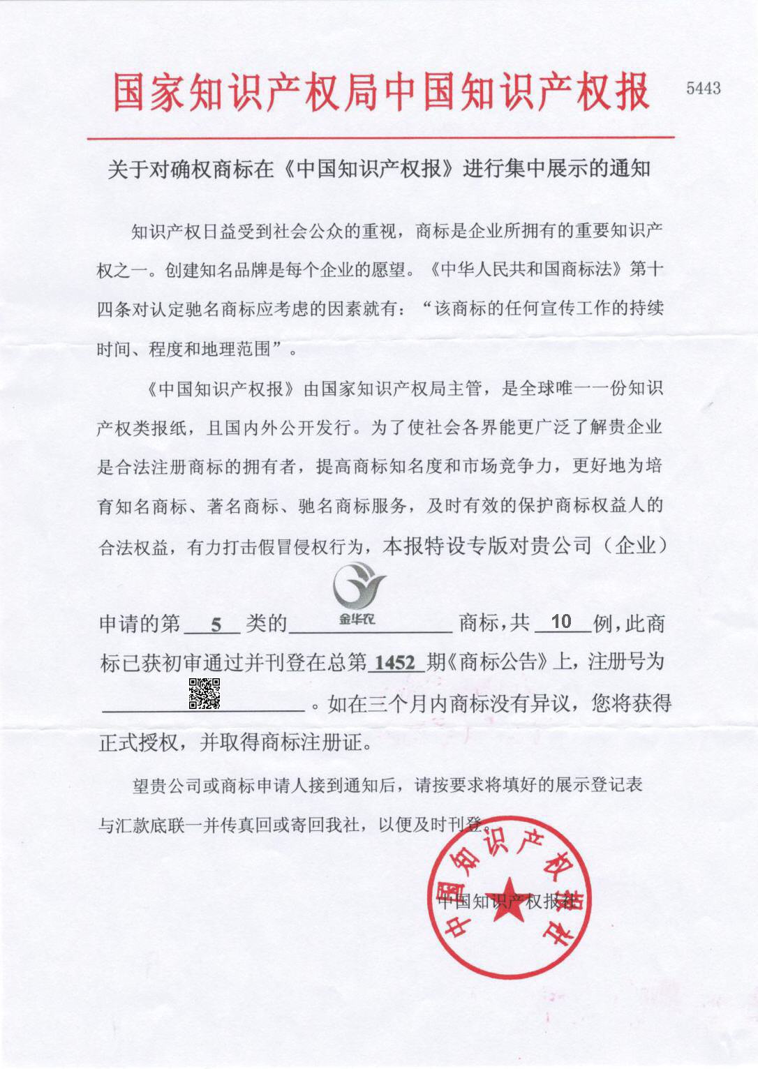 7月22日, 武漢金華農(nóng)生物喜獲國家工商總局頒發(fā)“馳名商標(biāo)”認(rèn)證。經(jīng)國家知識產(chǎn)權(quán)局授權(quán),中國知識產(chǎn)權(quán)報、中國商報社聯(lián)合對武漢金華農(nóng)生物品牌戰(zhàn)略規(guī)劃、馳名商標(biāo)事項等進(jìn)行專題報道。