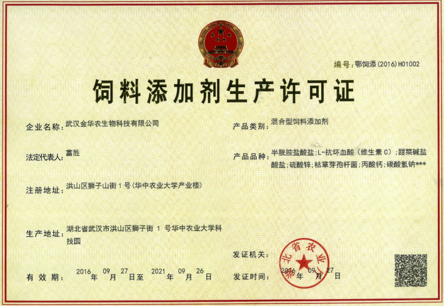 武漢金華農生物喜獲“新一代”飼料添加劑生產(chǎn)許可證